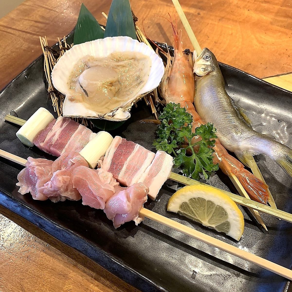 数あるいろりメニューの中から、 "これだけは絶対に食べて欲しい!" 【もも串】【ねぎま串】【名物!あゆ串】【赤海老一本串】【ホタテ片貝バター焼き】を厳選しました。初めてご来店の方は特におすすめです。※こだわりの火加減で、厨房にて焼いた状態でご提供いたします。